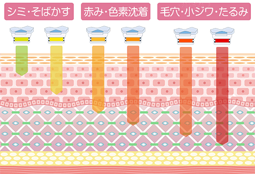 フォトフェイシャルM22は、6種類の光(波長)を、お一人お一人の肌の状態やお悩みに応じて選択し、光の強さ(照射出力)を細かく調整することで、今までのフォトフェイシャルよりも非常に高い、総合的な美肌効果が得られます。