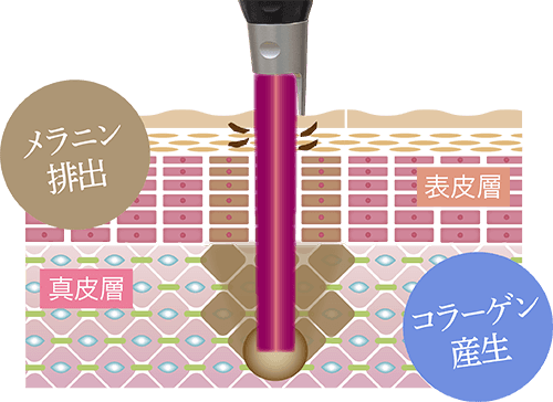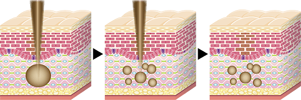 従来のフラクショナルレーザーは、皮膚表面に極小の穴を明けて作用を即すため、照射の痛みが強く、肌へのダメージも残りやすいため1週間程のダウンタイムがありました。