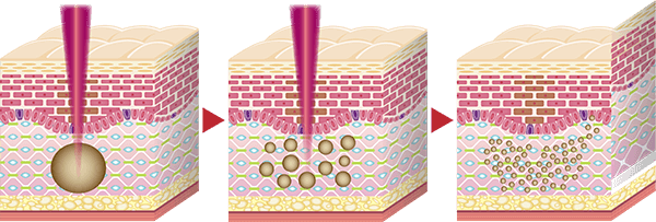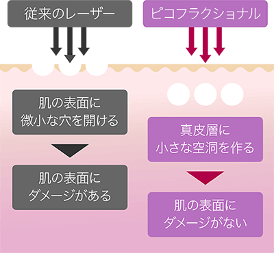 ピコレーザーは、今までのレーザー機と比較し、皮下組織を瞬時に蒸散させることで、熱の影響による表皮のダメージを低減、火傷のリスクとダウンタイムを大幅に改善し、痛みが最小限に抑えられています。