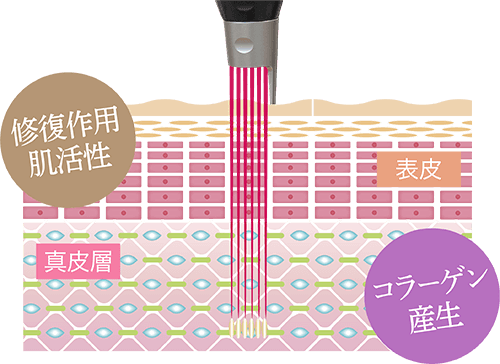 ピコフラクショナルは、真皮層に極小の穴を作ることで、修復作用によるコラーゲンやエラスチンの産生を活性化し、ニキビ跡や凸凹肌、毛穴の引き締め、小じわを改善し、ハリ弾力のある綺麗な肌に生まれ変わらせます。