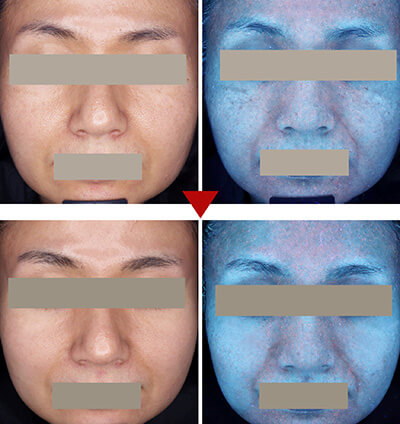 お顔全体にフォトフェイシャルM22の光を照射することで、肌細胞の働きが活性化し、くすみが改善され肌の透明感が得られます。