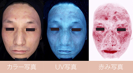 シミの分布、肝斑の存在、肌荒れ(炎症)の程度、白斑(色素脱失)の有無、毛穴のつまり具合などがわかります。